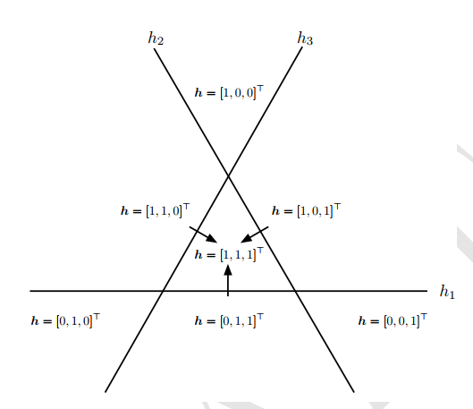 \(n\) 維二元向量是一個分布式表示的示例, 有 \(2^n\) 種配置, 每一種都對應輸入空間中的一個不同區域。這可以與符號表示相比較, 其中輸入關聯到單一符號或類別。如果字典中有 \(n\) 個符號, 那么可以想象有 \(n\) 個特征監測器, 每個特征探測器監測相關類別的存在。在這種情況下, 只有表示空間中 \(n\) 個不同配置才有可能在輸入空間中刻畫 \(n\) 個不同的區域。這樣的符號表示也被稱 為 one-hot 表示, 因為它可以表示成相互排斥的 \(n\) 維二元向量 (其中只有一位是激活的)。符號表示是更廣泛的非分布式表示類中的一個具體示例, 它可以包含很多條目,但是每個條目沒有顯著意義的單獨控制作用。下圖為分布式表示:
