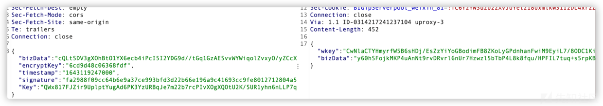 1、進(jìn)入正題啊,我這里抓的是發(fā)送短信接口的數(shù)據(jù)包,從數(shù)據(jù)包中可以看到總共有5個(gè)參數(shù),分別為bizData、encryptKey、timestamp、signature、Key,5個(gè)參數(shù),通過參數(shù)應(yīng)該能猜到bizData參數(shù)就是主要加密的內(nèi)容、我們要看的明文應(yīng)該就在里面,然后兩個(gè)key我們先不管,timestamp參數(shù)一看就知道是時(shí)間戳了,那signature參數(shù)看名字應(yīng)該是簽名的意思。