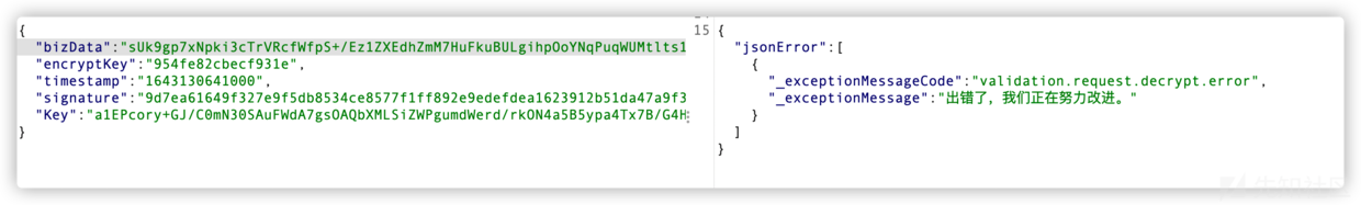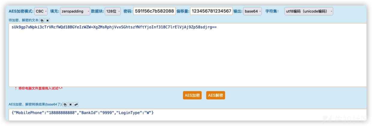 6、我們找一個(gè)有AES加密解密網(wǎng)站,填入秘鑰和iv偏移量,成功解密出數(shù)據(jù),接著修改明文里面的參數(shù)再加密,發(fā)現(xiàn)報(bào)錯(cuò)了、那應(yīng)該還有個(gè)signature簽名需要解密。