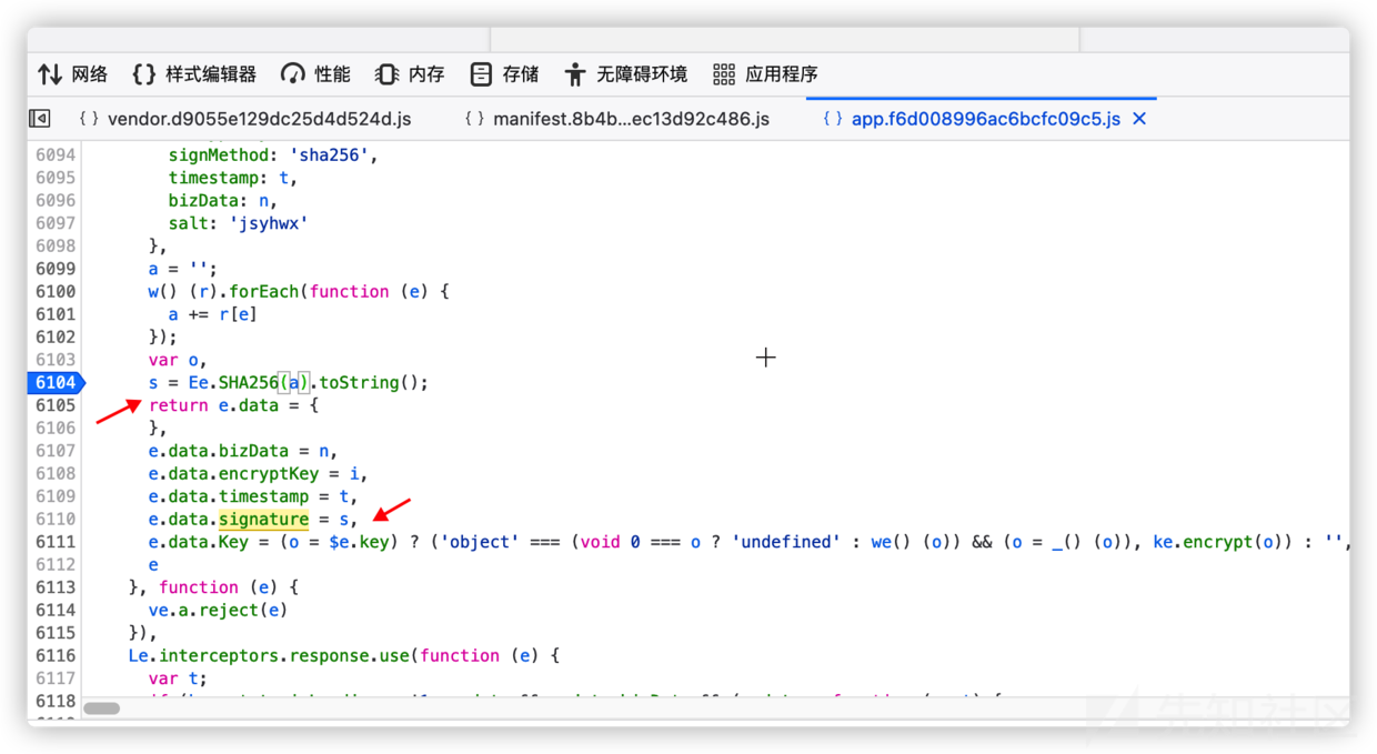 1、同樣操作,直接全局搜signature簽名,找到該處發(fā)現(xiàn)s應(yīng)該是生成簽名的地方,然后在s處設(shè)置斷點(diǎn),看代碼好像是SHA256加密的,那a就是加密前的數(shù)據(jù)了。