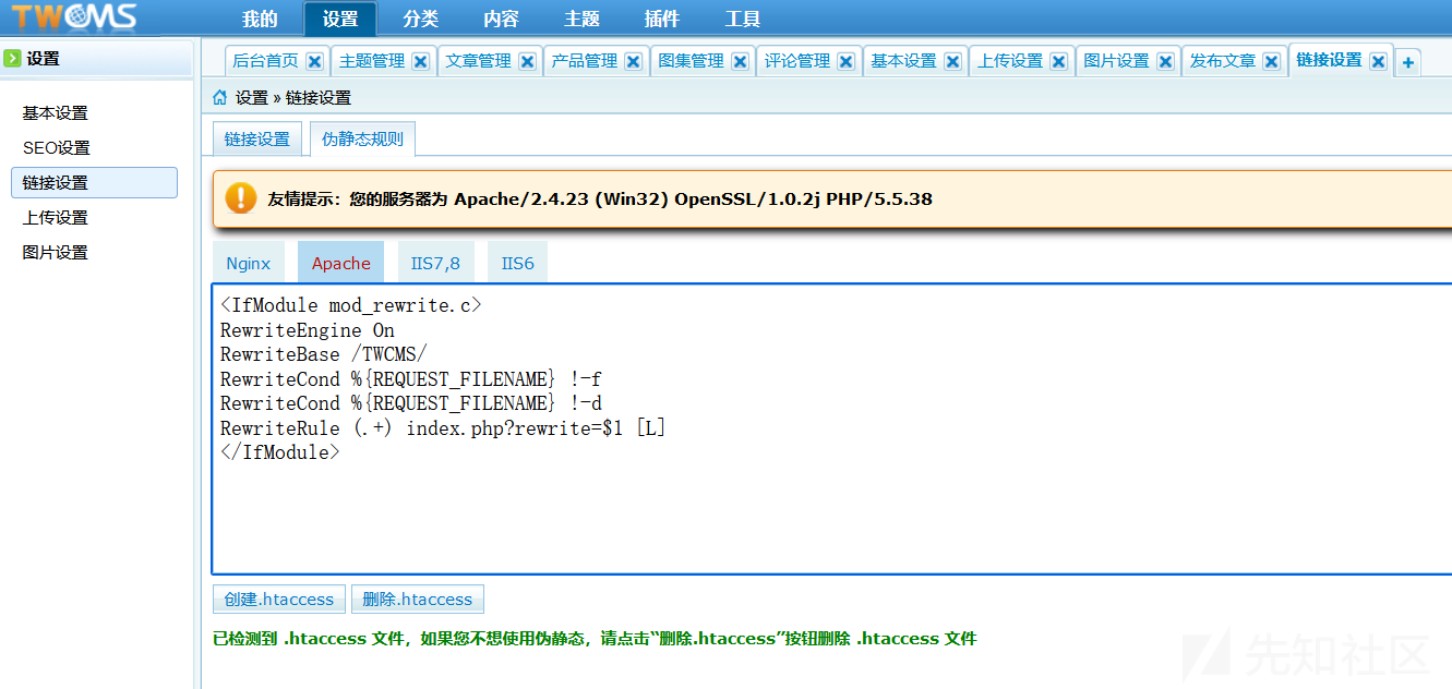 在設置-鏈接設置-偽靜態設置中apache模塊中可以設置.htaccess: