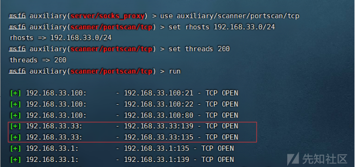 use auxiliary/scanner/portscan/tcp set rhosts 192.168.33.0/24 set threads 200 run