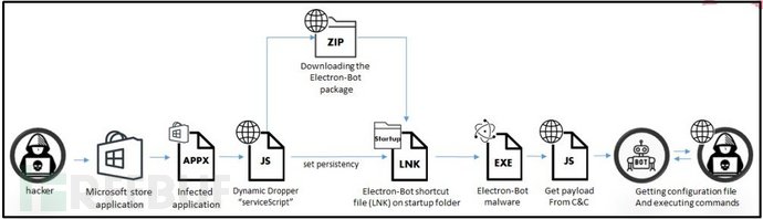 感染鏈開(kāi)始于受害者從微軟商店中安裝已被克隆的游戲軟件,在啟動(dòng)時(shí),后臺(tái)會(huì)動(dòng)態(tài)加載一個(gè)JavaScript滴管,以獲取Electron Bot的有效載荷并進(jìn)行安裝。惡意軟件會(huì)在系統(tǒng)下一次啟動(dòng)時(shí)運(yùn)行,并連接到 C2,檢索其配置并執(zhí)行攻擊者的任意命令。由于主要的腳本在運(yùn)行時(shí)動(dòng)態(tài)加載,存儲(chǔ)在設(shè)備內(nèi)存中的JS文件非常小,看起來(lái)也很無(wú)害。