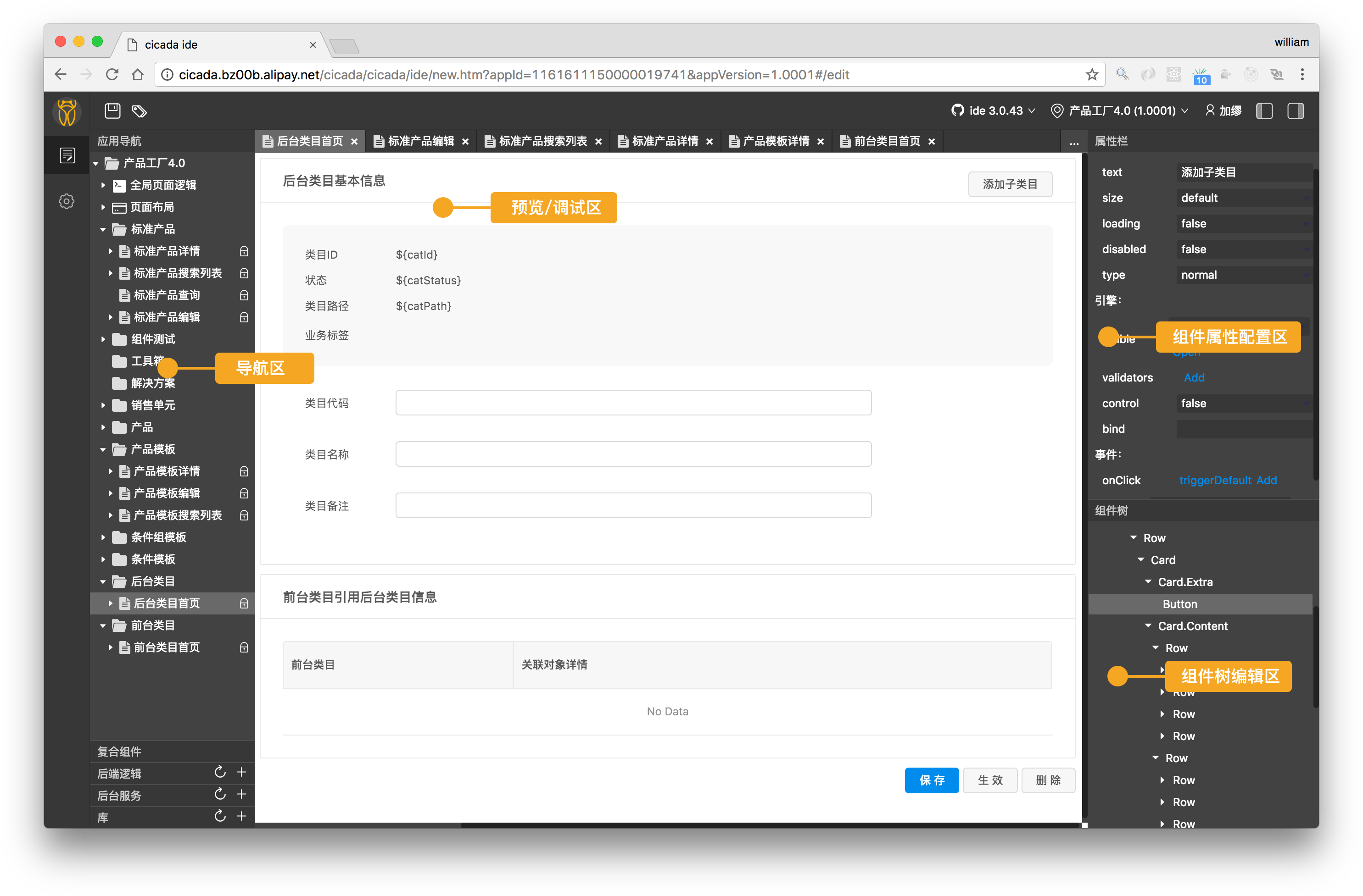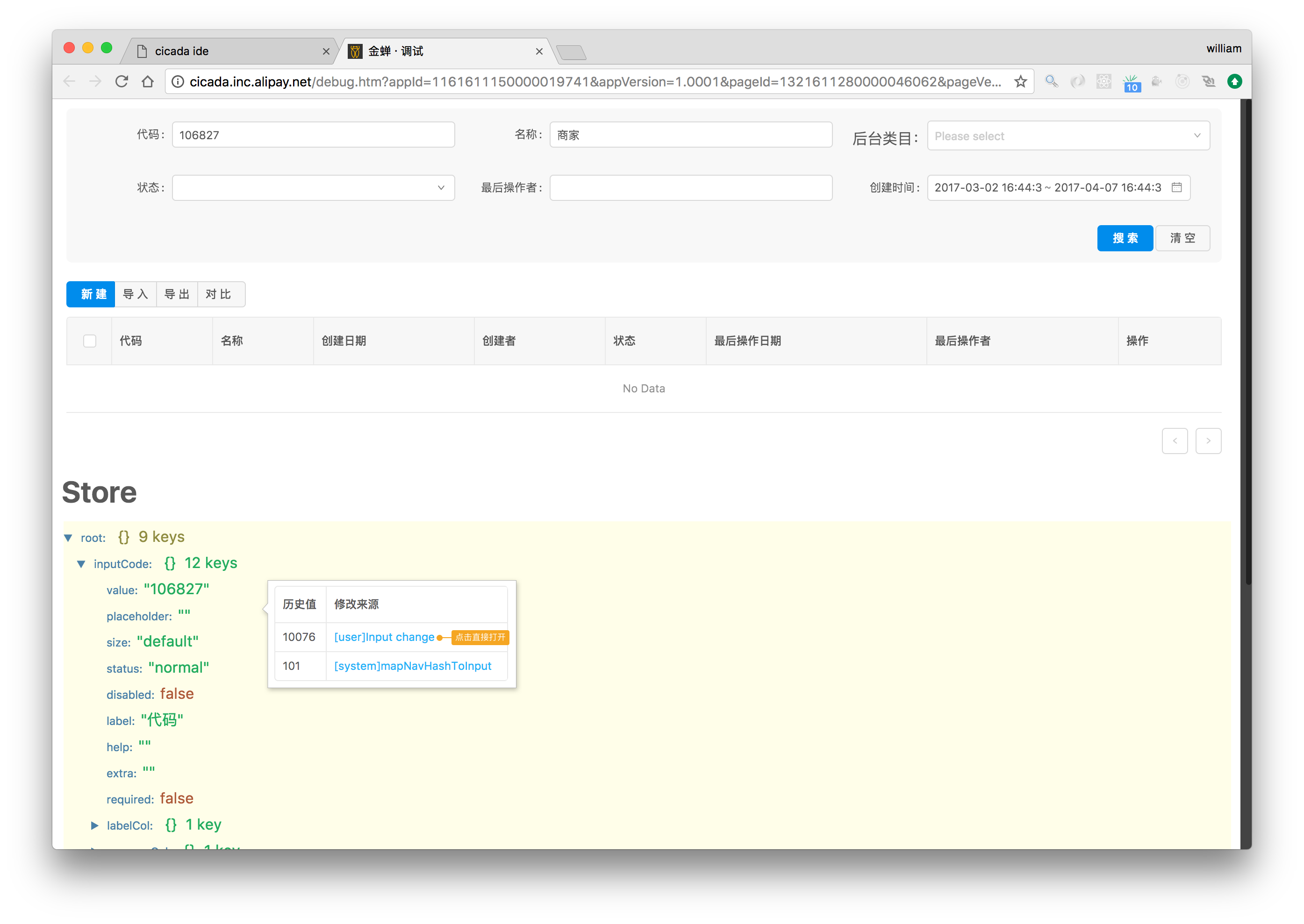 我們對平鋪的組件結構,抽象出了數據樹的概念。通過對數據樹的操作,可以完美的控制整個組件樹,也就是整個應用。而一些上升到應用框架層的高級功能,例如表單的校驗等,也是建立在數據樹上的。有了數據樹,實際上就等于有了真個頁面的邏輯入口。下圖展示著在調試模式下,用戶可以直接看到的數據樹。