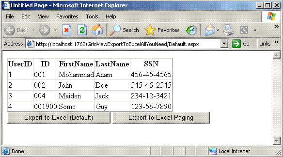 Btn_ExportExcelPaging(object sender, EventArgs e) { DisableControls(gvUsers); Response.ClearContent(); Response.AddHeader("content-disposition", "attachment; filename=MyExcelFile.xls"); Response.ContentType