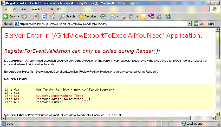 如果要導出的GridView中包含LinkButton或者分頁(出現分頁碼時,譯者注) 則將出現錯誤: