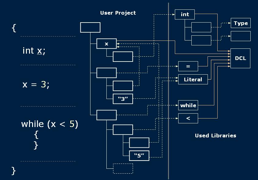 看到了嗎?以前int,while這樣的節點的含義是由編譯器來解釋的,因而是固定的,沒法擴充的。而現在,這些節點是引用到了它們的定義節點,而這些定義就是intention,而具體int,while在語句中的出現就是intention 的instance。由于intention不是寫死在編譯器中的,是以intention庫的形式提供的,也就是說AST節點中能出現的節點種類是無限制的,從而繼不再有語法限制之后,不再有語言特征的限制了。你可以自己添加關鍵字,自己添加語言特性了。