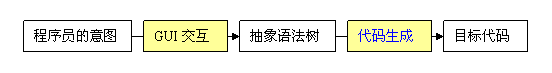 從圖中可以看到,GUI的交互代替了文法解析。而我用藍色標注意圖編程的“代碼生成”的目的是把它與上面的代碼生成區別開來,因為兩者的實現手段是完全不同的。因為在解析和代碼生成兩個階段的巨大差異,所以我說意圖編程對于傳統的編譯理論是一種顛覆。 具體來看一個例子就能說明兩種過程之間的區別了,先來看傳統的語言: