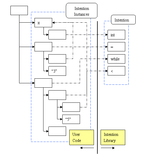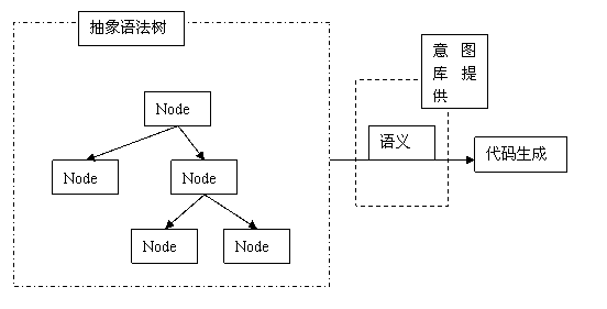 這里所說的意圖庫具體是什么在下面描述,這里所提供的語義是抽象意義上的,具體的實際表現就是意圖庫完全操控了從抽象語法樹到目標代碼的代碼生成過程,在這個代碼生成過程中體現了其語義,從而體現了一定的語言特征。 如此定義語義,定義語言特征,如此根據語言特征劃分程序語言,可以得出一個意圖編程包含面向過程∪面向對象∪泛函∪邏輯∪……的結論。