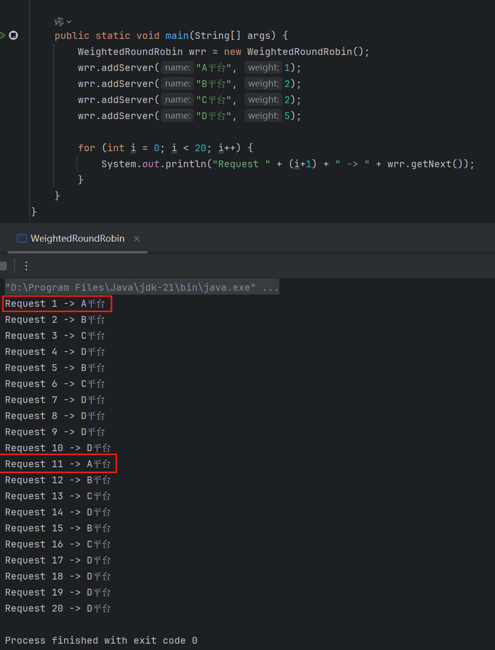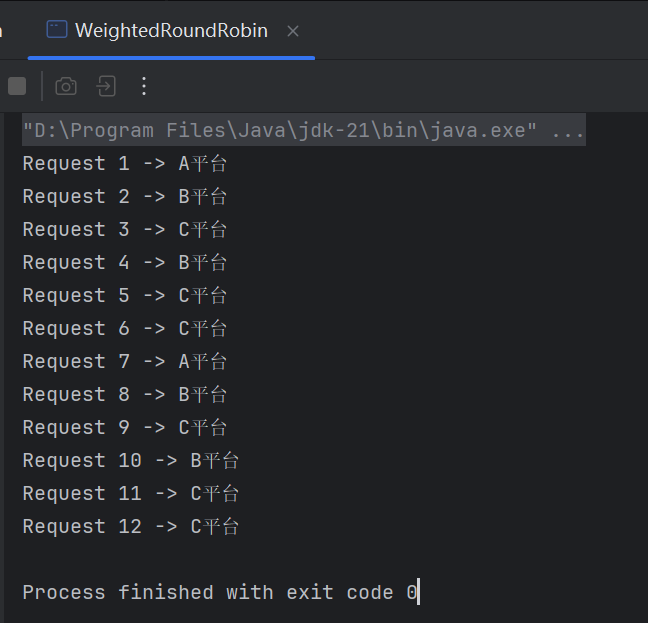System.out.println("Request " + (i+1) + " -> " + wrr.getNext());