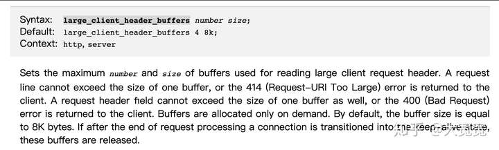 再比如nginx用large_client_header_buffers 指令來分配請(qǐng)求頭中的很長數(shù)據(jù)的buffer。這個(gè)buffer可以用來處理url,header value等。