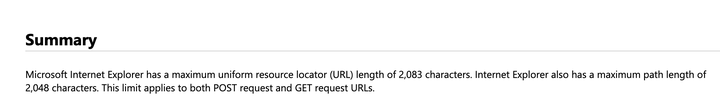 先說瀏覽器。不同瀏覽器不太一樣。比如我們常說的2048個(gè)字符的限制,其實(shí)是IE8的限制。并且原始文檔的說的其實(shí)是“URL的最大長度是2083個(gè)字符,path的部分最長是2048個(gè)字符“。見https://support.microsoft.com/en-us/help/208427/maximum-url-length-is-2-083-characters-in-internet-explorer。IE8之后的IE URL限制我沒有查到明確的文檔,但有些資料稱IE 11的地址欄只能輸入法2047個(gè)字符,但是允許用戶點(diǎn)擊html里的超長URL。我沒實(shí)驗(yàn),哪位有興趣可以試試。