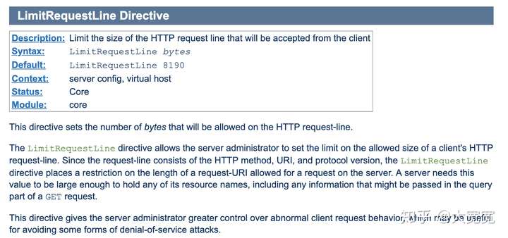 apache實(shí)際上限制的是HTTP請(qǐng)求第一行“Request Line“的長度,即<METHOD><URL> <VERSION>那一行。