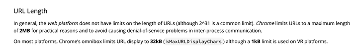 Chrome的URL限制是2MB,見https://chromium.googlesource.com/chromium/src/+/master/docs/security/url_display_guidelines/url_display_guidelines.md