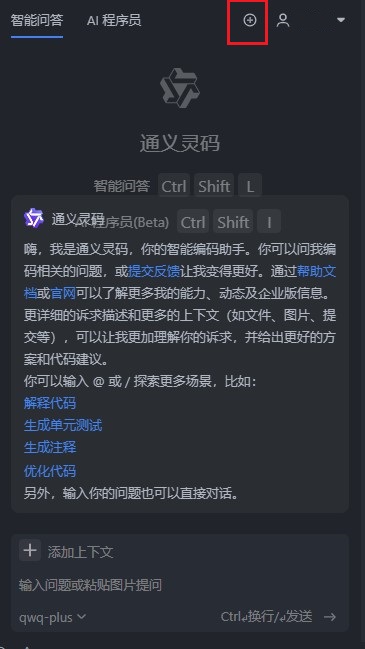 **創建新會話:**在智能問答的右上角有一個圓形 ?+? 號按鈕,點擊即可創建新對話。