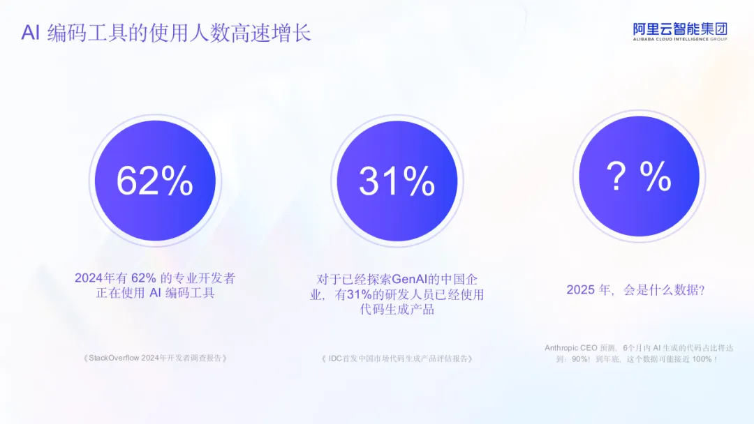 確實,這里有一些數(shù)據(jù)值得注意,即目前 AI 編碼工具的使用者數(shù)量。我們看到其增長速度相當快。到 2024 年,大約 62% 的專業(yè)開發(fā)者將使用AI編碼工具。而對于那些已經(jīng)探索生成式AI的中國企業(yè),有 31% 的研發(fā)人員目前在使用這類代碼生成產(chǎn)品。那么,到 2025 年又會是怎樣的情況呢?我這里備注了 Anthropic 的 CEO 的一些預(yù)測,雖然這些預(yù)測可能較為樂觀。他預(yù)計,在未來三個月,AI 生成的代碼占比將達到 90%。而根據(jù) 2024 年的數(shù)據(jù),這一比例可能還在 30% 左右。按照他的預(yù)測,未來半年內(nèi)這一比例可能會達到 90%,并在一年內(nèi)接近 100%。