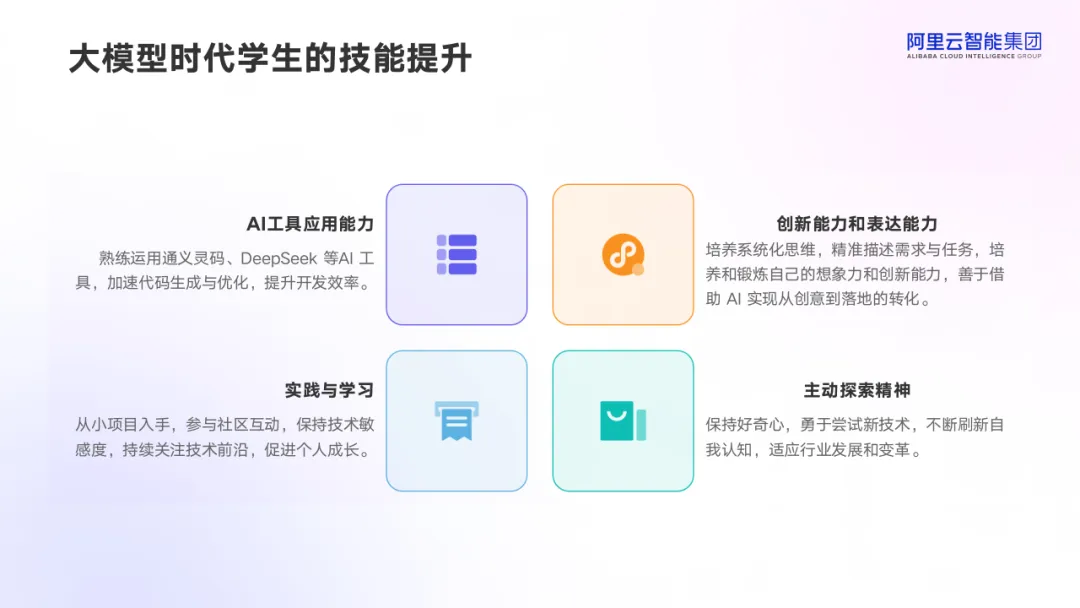 在大模型時代,學(xué)生開發(fā)者應(yīng)重點提升 AI 工具的應(yīng)用能力,熟練使用如 DeepSeek、千問、ChatGPT 等工具,以及通義靈碼來輔助代碼編寫和文檔生成,提高開發(fā)效率。