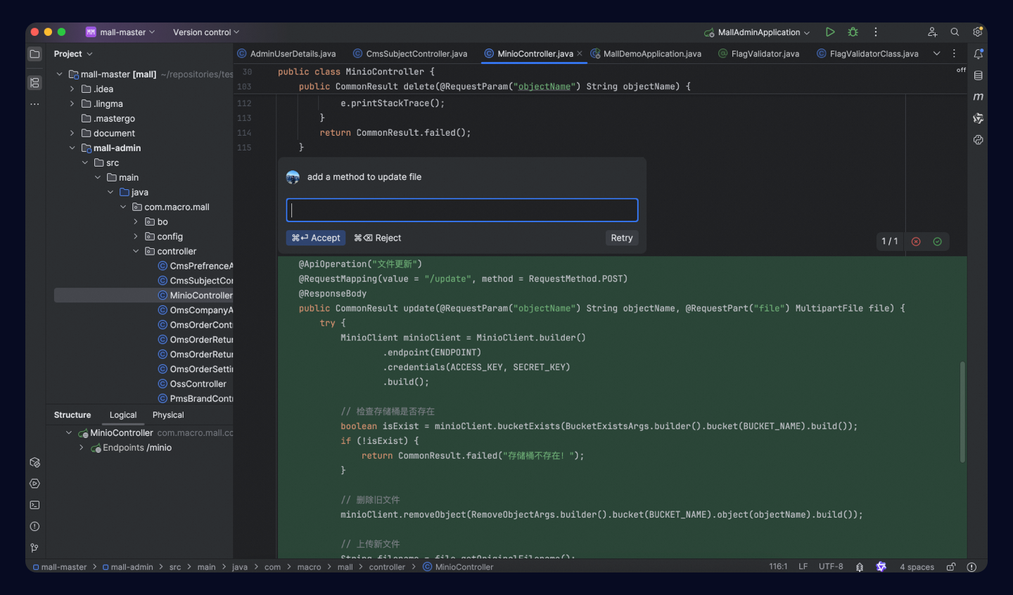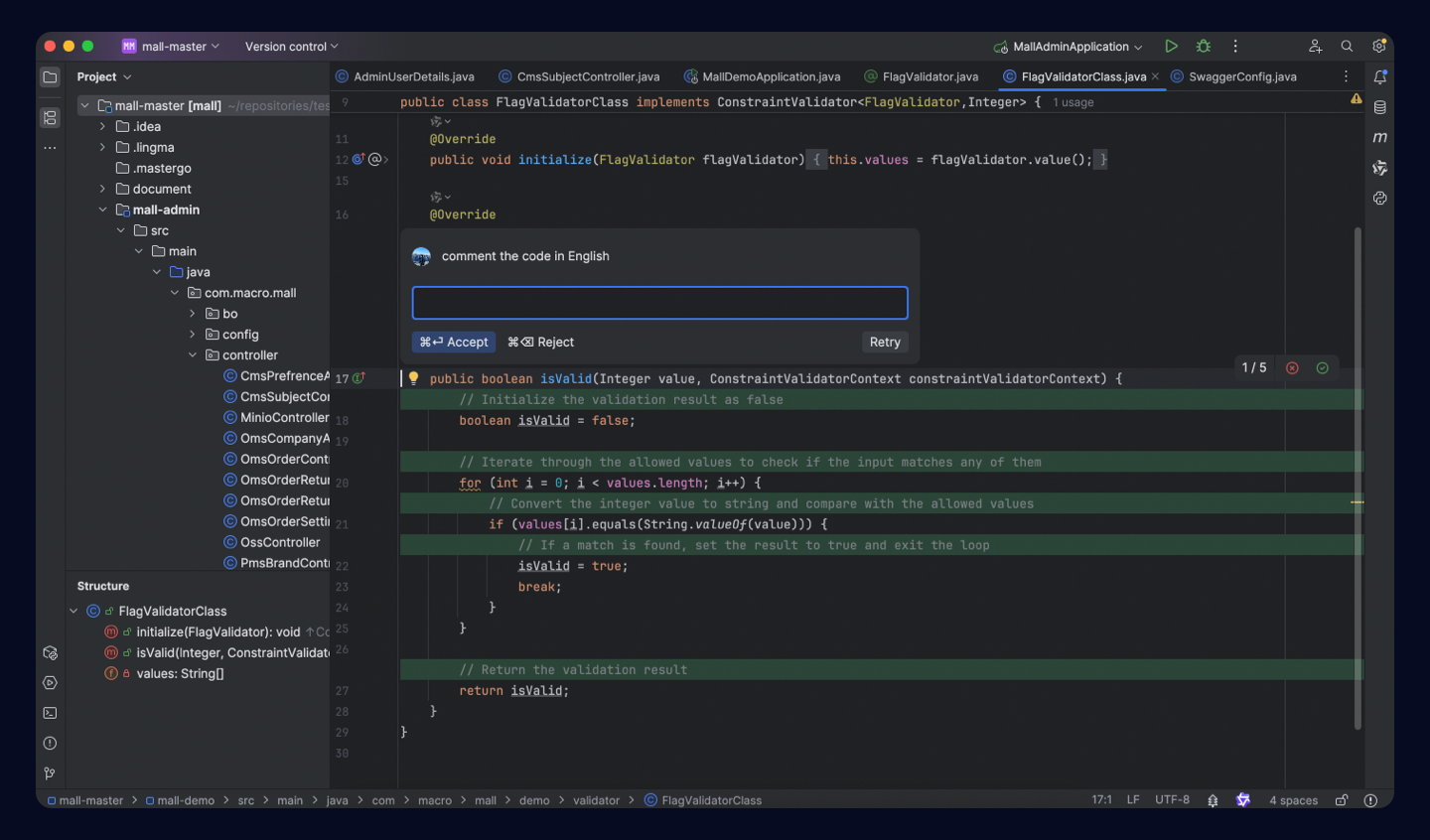 當你需要對代碼文件或片段進行修改時,選擇代碼片段并喚起行間會話窗口后,可輸入代碼修改要求,如增加注釋、重構代碼等,通義靈碼可直接在代碼編輯器中生成代碼變更。