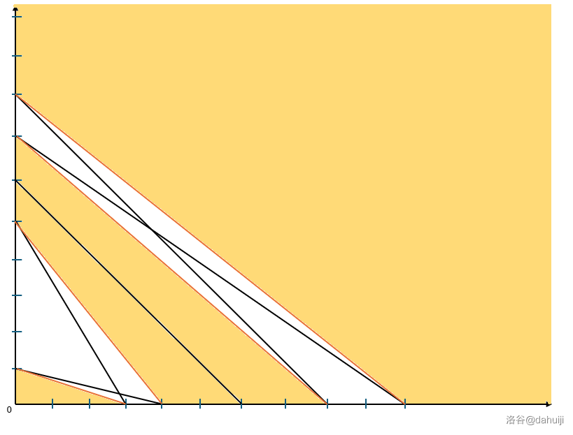 我們可以發現,\(x\) 的上下界都是非嚴格單增的。所以可以把可以從中間穿過的部分視為連通塊。(如下圖黃色部分,圖來自 @dahuiji 的題解)