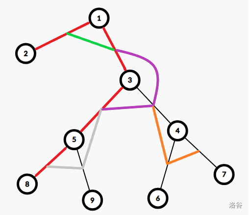 就如上圖,我們是拿邊 \((5,8)\) 生成的。此時向 \(8\) 節點走,發現 \(8\) 節點構成的鏈的起點一定是 \((5,8)\),而其終點 \((3,5)\) 則可以作為另一個根。于是就這樣不斷地從鏈的起點到鏈的終點,而鏈的終點又是下一個鏈的起點。這樣不斷遍歷,最終會到達一個葉子節點。