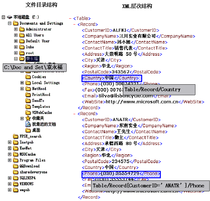 我們理解XPath時可以參考文件目錄結(jié)構(gòu)FilePath,在Windows資源管理器左邊的文件目錄樹狀列表中,可以看到各種文件對象,包括磁盤根目錄,各級文件目錄等等,它們共同構(gòu)成了一個樹狀結(jié)構(gòu),我們選擇對象時既可以在這個樹狀結(jié)構(gòu)中一個個查找,也可以指定路徑名來進行快速定位,文件系統(tǒng)的路徑名采用斜杠號來分隔各個目錄層次的目錄名。比如在這個示意圖中,我們選中的目錄,可以使用路徑名”c:\documents and settings\袁永福”來快速定位。