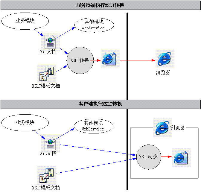在客戶端執(zhí)行XSLT轉(zhuǎn)換時,應(yīng)用系統(tǒng)的業(yè)務(wù)模塊生成包含要顯示的數(shù)據(jù)的XML文檔,加上XSLT轉(zhuǎn)換信息標記,直接發(fā)送到客戶端瀏覽器,客戶端瀏覽器獲得這個XML文檔,根據(jù)其中的XSLT轉(zhuǎn)換信息標記,從服務(wù)器上下載指定名稱的XSLT文檔。然后調(diào)用自己的XSLT轉(zhuǎn)換器進行轉(zhuǎn)換,在內(nèi)存中生成了HTML文檔并顯示出來。此時顯示的HTML頁面不會出現(xiàn)在瀏覽器的緩沖文件夾中,也看不到HTML源代碼,只能看到XML的源代碼。