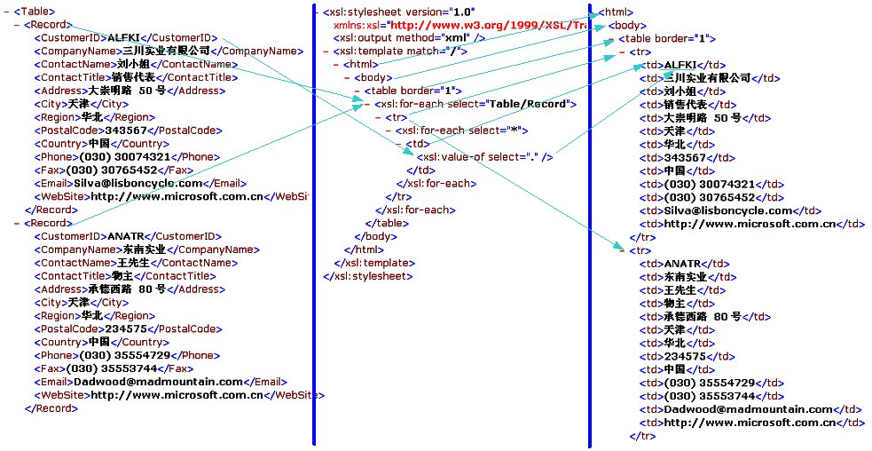 xsl:for-each 元素類似C#中的foreach 語法結(jié)果,表示循環(huán)遍歷元素,它使用select屬性指定一個XPath相對路徑,XSLT使用這個相對路徑查詢所有要遍歷的XML節(jié)點,此時當(dāng)前節(jié)點就是XML文檔本身,因此XSLT處理器會調(diào)用XmlDocument的SelectNodes 函數(shù)來獲得要遍歷的XML節(jié)點,函數(shù)的參數(shù)就是Table/Record。于是我們開始循環(huán)遍歷所有的Record元素了。