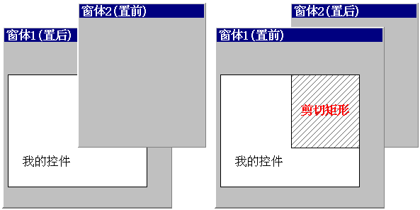 如圖所示,窗體2覆蓋了窗體1,此時(shí)我的控件有一部分被覆蓋了,當(dāng)用戶設(shè)置了窗體1靠前顯示時(shí),我的控件原先被窗體2覆蓋的部分給顯示出來(lái)了,此時(shí)形成了一個(gè)剪切矩形,程序需要重新繪制我的控件的用戶界面,很顯然,程序只需要繪制剪切矩形所包括的部分,其他的部分就不需要顯示,這樣我們就能使用這個(gè)剪切矩形來(lái)優(yōu)化我們的程序,減少圖形繪制工作量。