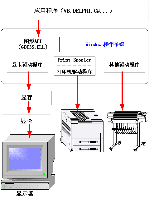 Windows操作系統(tǒng)中包含了一個(gè)圖形子系統(tǒng),專門用于管理各種圖形輸出設(shè)備,包括顯示器,打印機(jī),繪圖儀等。由于Windows系統(tǒng)啟用保護(hù)模式,應(yīng)用程序沒(méi)有權(quán)限直接訪問(wèn)計(jì)算機(jī)硬件,因此都必須調(diào)用Windows的圖形子系統(tǒng)來(lái)操作圖形設(shè)備。下圖就是Windows環(huán)境下圖形軟件的基本原理。