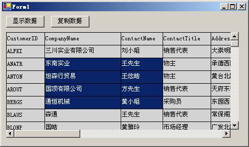 使用VS.NET2003打開這個工程,按下F5運行,可以看到主窗體上有一個“顯示數據”按鈕,按下該按鈕,然后進行單步跟蹤狀態,可以看到程序首先從程序資源文件 DataTable.dat 中反序列化加載一個DataTable對象,這個DataTable.dat 文件是事先生成的,這樣做是為了簡化這個軟件的代碼,我們也可以連接數據庫查詢數據獲得一個DataTable對象,其效果是一樣的。