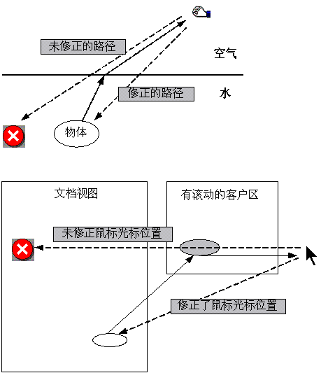 當用戶界面發生滾動時也會有類似的折射效應。控件客戶區中顯示了一個圖形,由于發生了滾動,則該圖形在文檔視圖中的位置不等于在控件客戶區中的位置,兩者存在一個偏移量,這個偏移量就是控件的滾動量。