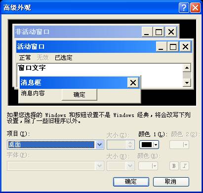 類型SystemBrushes定義了一些系統顏色的畫刷對象,系統顏色是指Windows操作系統預先定義的標準顏色,包括桌面背景色,窗體顏色,菜單控件文本顏色,3D邊框中的亮邊框顏色,暗邊框顏色,提示文本顏色和背景色,高亮度選擇狀態的文本顏色和背景色等等。打開操作系統桌面屬性,可以進入這些系統顏色定義對話框,該對話框樣式如圖所示。