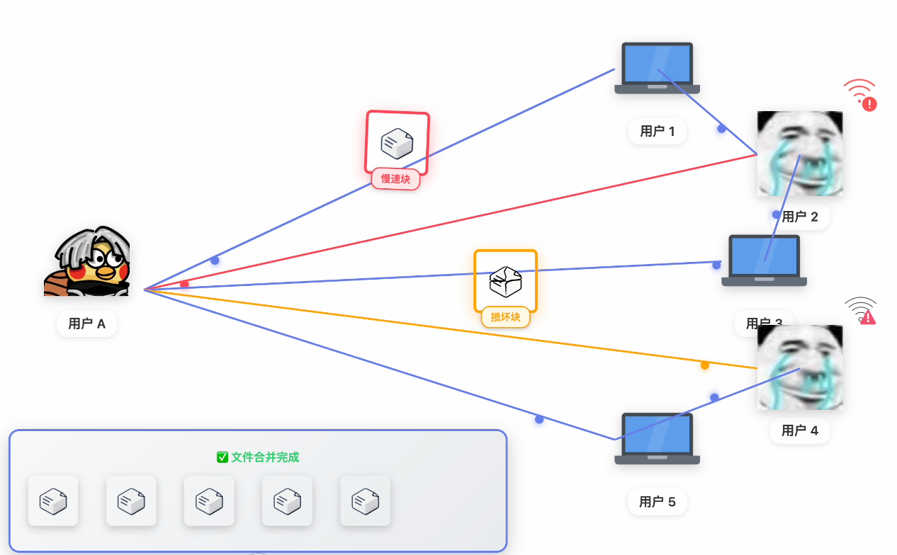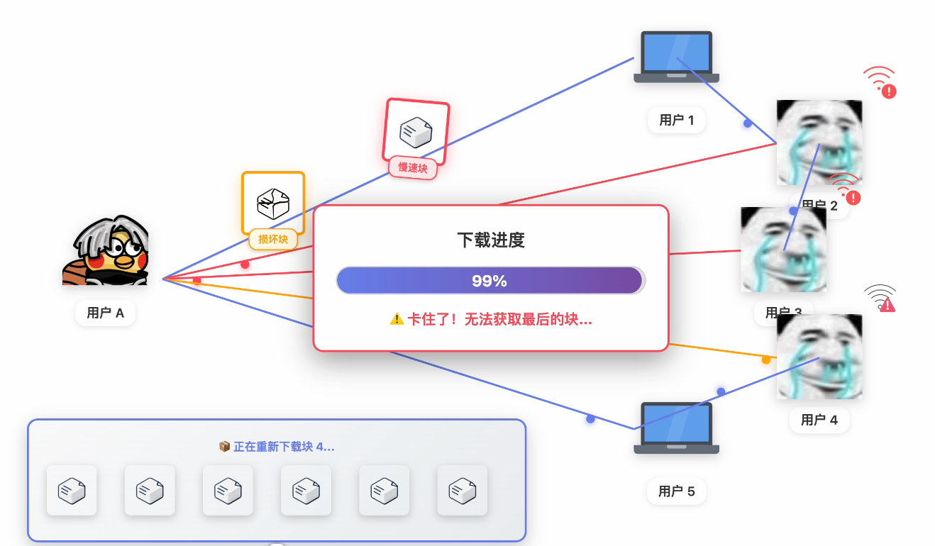 魚皮:正是因為數(shù)據(jù)來源太多太雜,如果某個用戶網(wǎng)速超慢或者中途掉線,最后就有可能一直卡住,等待最慢的塊;而且如果因為網(wǎng)絡(luò)不穩(wěn)定,導(dǎo)致傳輸過程中數(shù)據(jù)損壞了怎么辦?