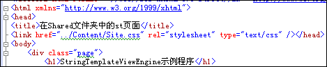<!DOCTYPE html PUBLIC "-//W3C//DTD XHTML 1.0 Strict//EN" "http://www.w3.org/TR/xhtml1/DTD/xhtml1-strict.dtd"> <html xmlns="http://www.w3.org/1999/xhtml"> <head> <title>在Shared文件夾中的st頁面</title> <link href="../Content/Site.css" rel="stylesheet" type="text/css" /></head> <body> <div class="page"> <h1>StringTemplateViewEngine示例程序</h1> <div id="menucontainer"> $Views/Shared/menu()$ </div> <div id="main"> $msg$ </div> </div> </body> </html>