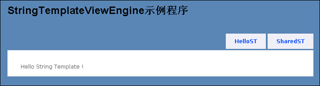 示例中的代碼十分簡單, "$msg$"是StringTemplate的模板語言, 可以識(shí)別名稱為"msg"的變量. "$Views/Shared/menu()$"也是StringTemplate中的語法, 作用是加載名為menu的模板.