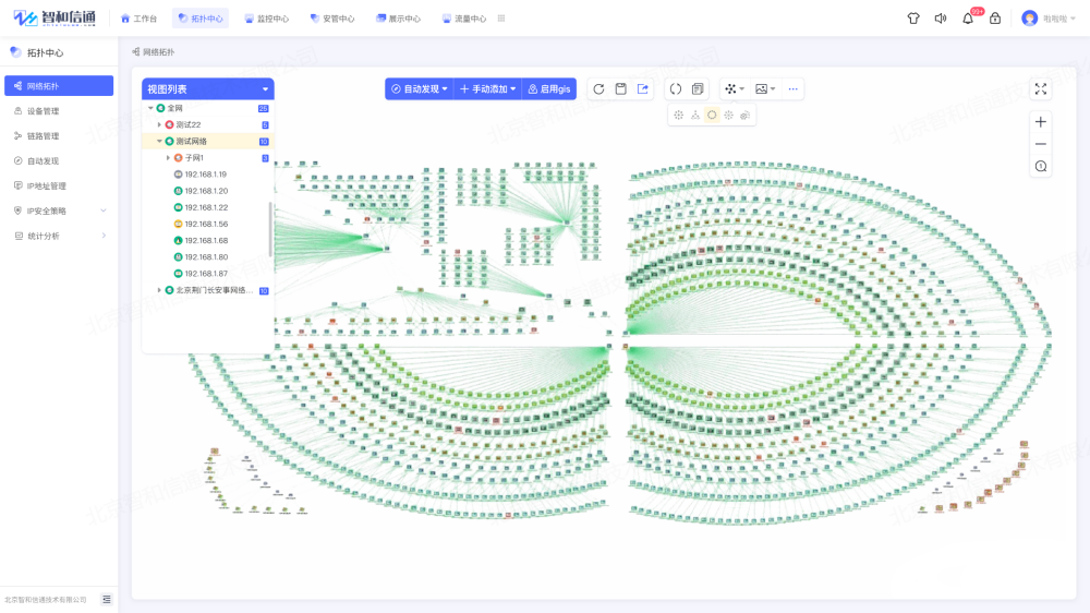 政務網絡架構中軟硬件環境涉及的技術復雜,廠商眾多。北京智和信通通過網絡架構拓撲可視化能力,將網絡數據從離線表格轉移至平臺內,從靜態的網絡架構數據轉化為動態智能拓撲,通過樹形、平面結構聯動展示設備間鏈接關系,通過按片區、按地域、按層級等多種布局方式劃分網絡,實現全網設備、資源、鏈接關系、IP等實時更新、快速定位。